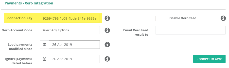 The connection key is a unique random series of digits that Discover allocates for you automatically and uses to identify your connection to Xero. Changing this number will disconnect you from Xero. This key is only needed in the situation in which you have two centres, and you would like boths centres to use the same Xero account. In this case, you would connect to Xero on one of the centres, and once connected, use the same connection key in the other centre.