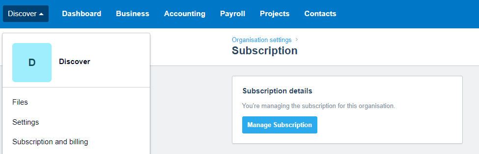 1) In Xero, click on your Company name at the top left corner > Subscription and Billing.