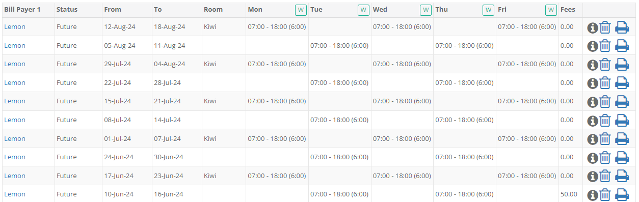 Once the repeating pattern has been set up, the bookings will be visible on the Enrolments tab in order of the alternating pattern.