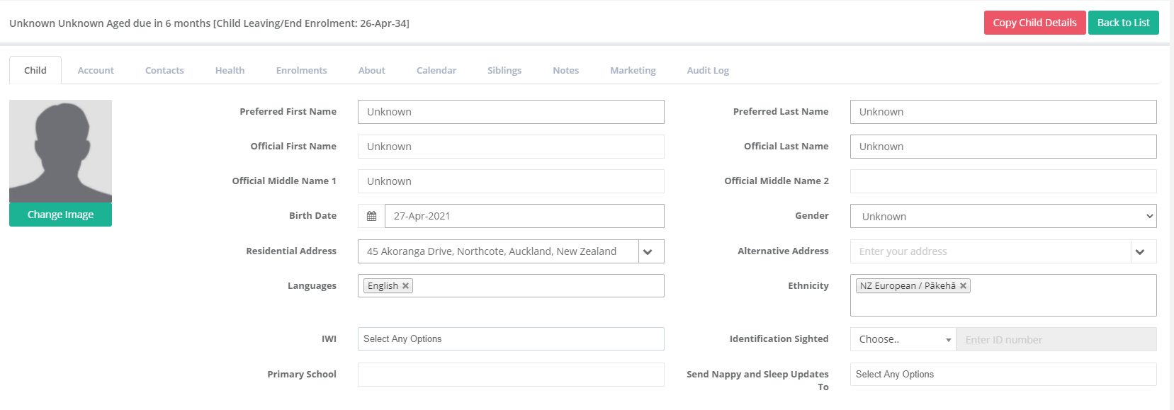 - If the child has no siblings currently at the centre, you can create a child by clicking Children > Create New and fill out the key child details as above to create the child. You can set the first name as "Baby" and we recommend using the family's surname.