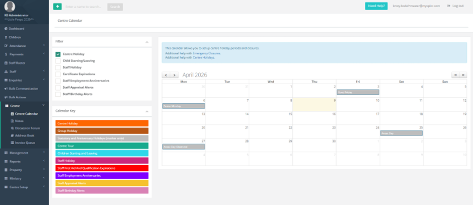 Navigate to Centre > Centre Calendar