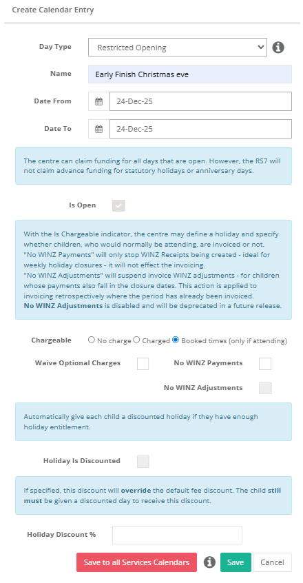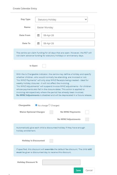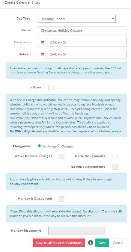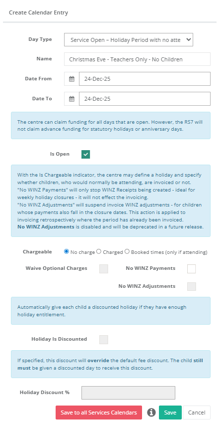 - Select Day Type > Service Open – Holiday Period with no attendances