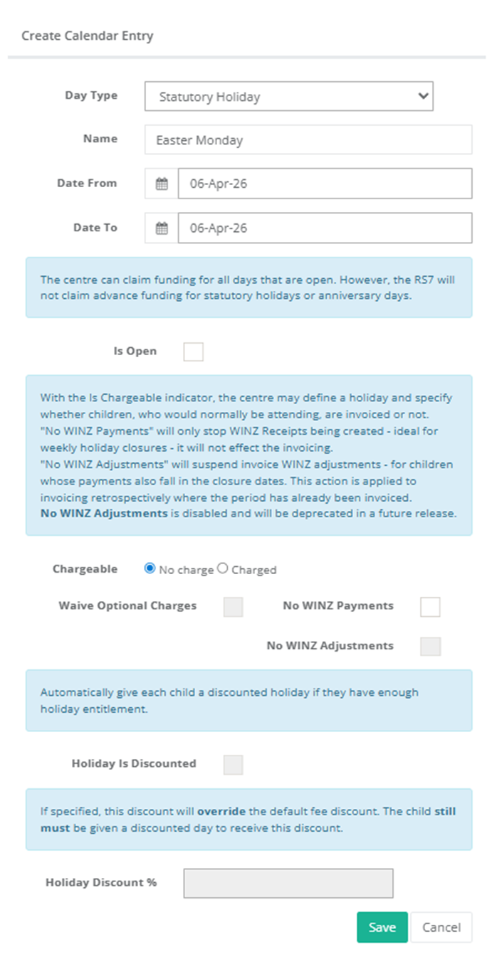 Tick “Holiday is Discounted” to automatically give eligible children a discounted holiday.