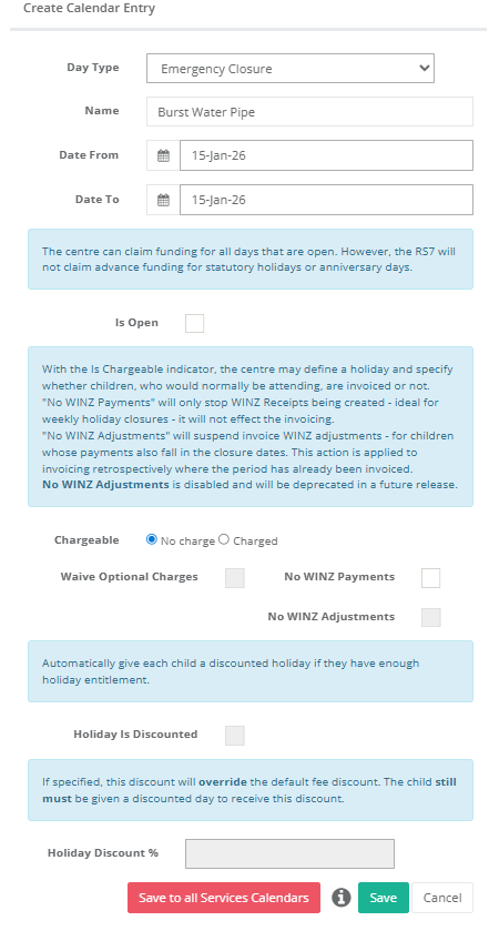 You will need to select the Emergency closure for the days your centre is normally open and between your current centre holidays - i.e. not Sat/Sun, just select Mon - Fri for a week at a time and in between the public holidays (when you are normally closed, if that is the case).
