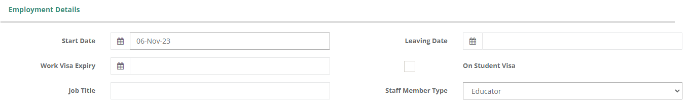 - Under 'Employment Details', select 'Educator' in the 'Staff Member Type' field.