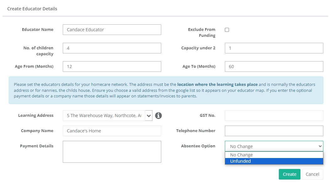 2. Enter the Educator's details, including capacity, age range, address and absentee option.