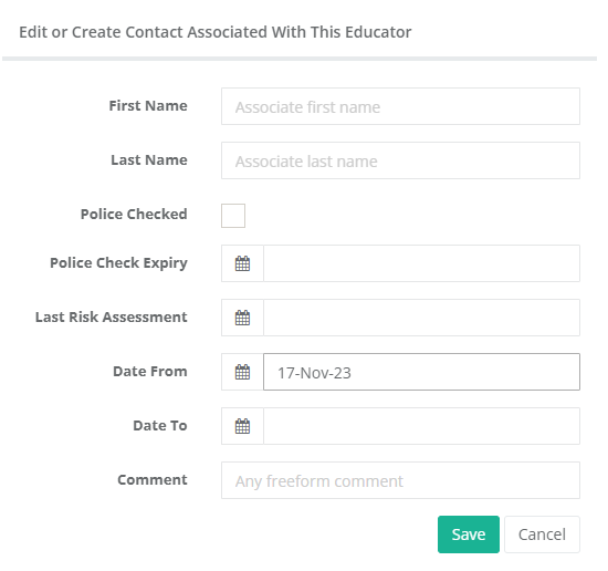 These adults are also required to undergo police checks and be vetted appropriately, regardless of whether they are present in the home during operating hours normally. To help services track who these associates are and make sure these checks are up to date, they can be added via the Associates tab on the Educator's profile.