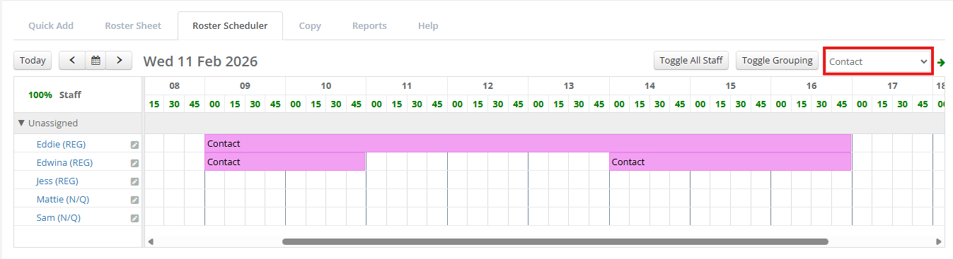 - At 2pm, we will once again use the drop down menu to select Contact. This will reflect the split working pattern and will the Roster Sheet will look to fill the remainder of the day with the chosen task.