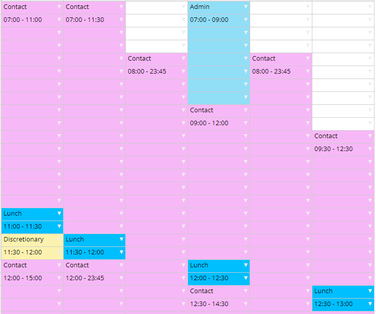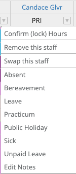 An assigned task can be edited by selecting the arrow at the time they wish to change the shift type and select a new task from the dropdown.