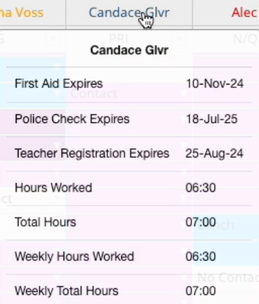 5. Staff Members: This shows the names of the Staff Members rostered. Directly underneath their name, admins have a quick view of their qualifications.