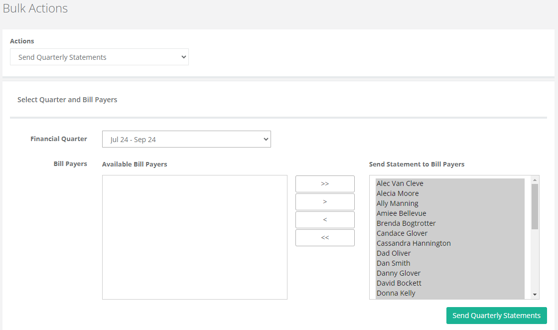 - Navigate to Bulk Actions > select 'Send Quarterly Statements'.