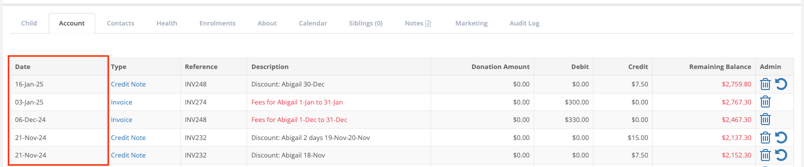 This is the date in the far left column on the child's Account screen or the bill payer's Transactions screen.