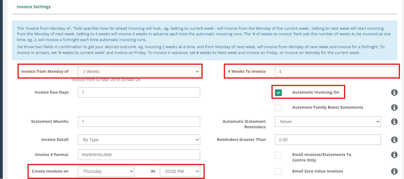 Payment automation will work best when Automatic Invoicing On has been selected / is ticked. With this setting enabled, enrolment invoices will be created based on these following highlighted settings: