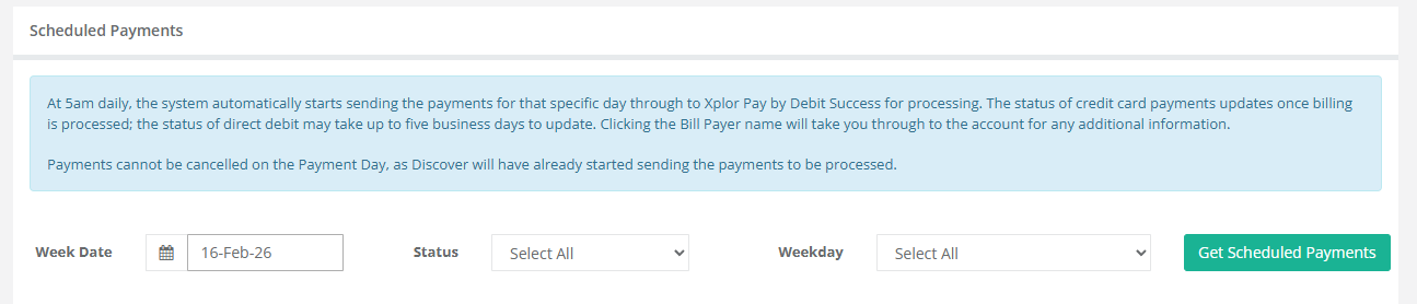 Scheduled Payments will provide you with a reporting function that presents all scheduled directdebit payments on a weekly basis. Here, can see the status of each payment visible in the report (pending, cancelled, sent, failed and not sent).