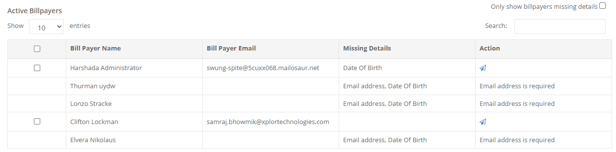 Active Bill Payers provides a list of all Billpayer contacts at your service that have Pay by direct debit/credit activated within their profile. You will be presented with a list outlining each Bill Payer, their Email, any Missing Details on their profile and an Action opportunity to send them a Payments sign-up link to their selected email.