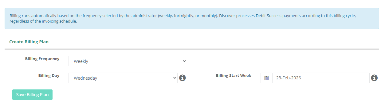 Here you can select your Billing Frequency (Weekly, Fortnightly or Monthly), Billing Day and the Billing Start Week. Payments will be scheduled according to the chosen billing frequency, commencing from the selected Billing Start Week.