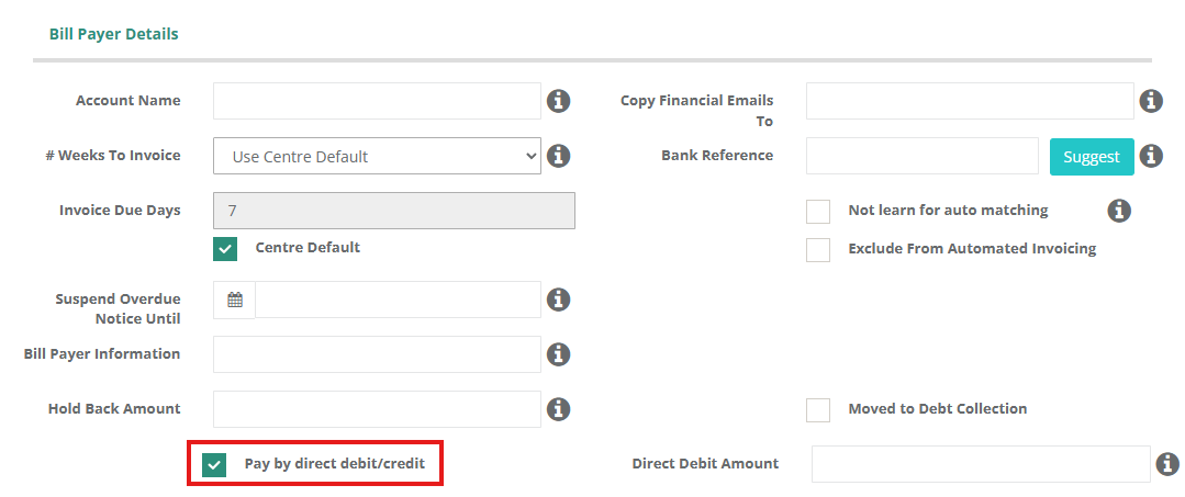The Direct Debit Amount feature is a useful tool when attempting to gradually reduce a large, overdue balance on a parent account, or to ensure ongoing payments of a less than usual amount if a family is in strife. This field can remain empty, however, when a direct debit is processed it will attempt to debit the entirety of the outstanding balance in one single transaction.