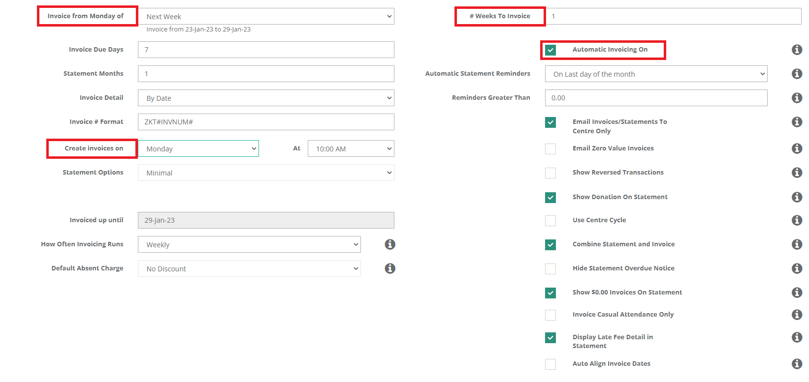 To switch on Automatic invoicing, navigate to your left-side menu > Centre Settings > Centre Details tab > Invoice settings.