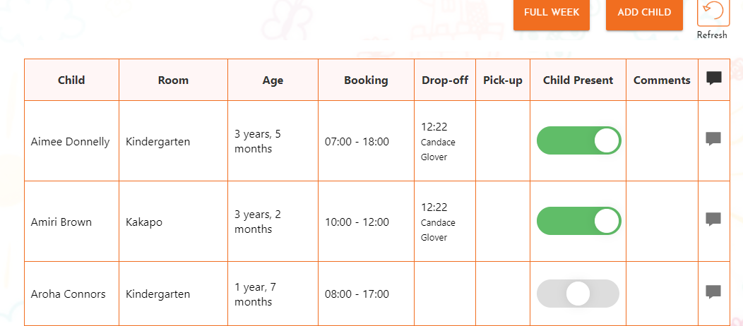 2) Use the toggle under the 'Child Present' column to indicate whether the child is attending (right = attending, left = absent).