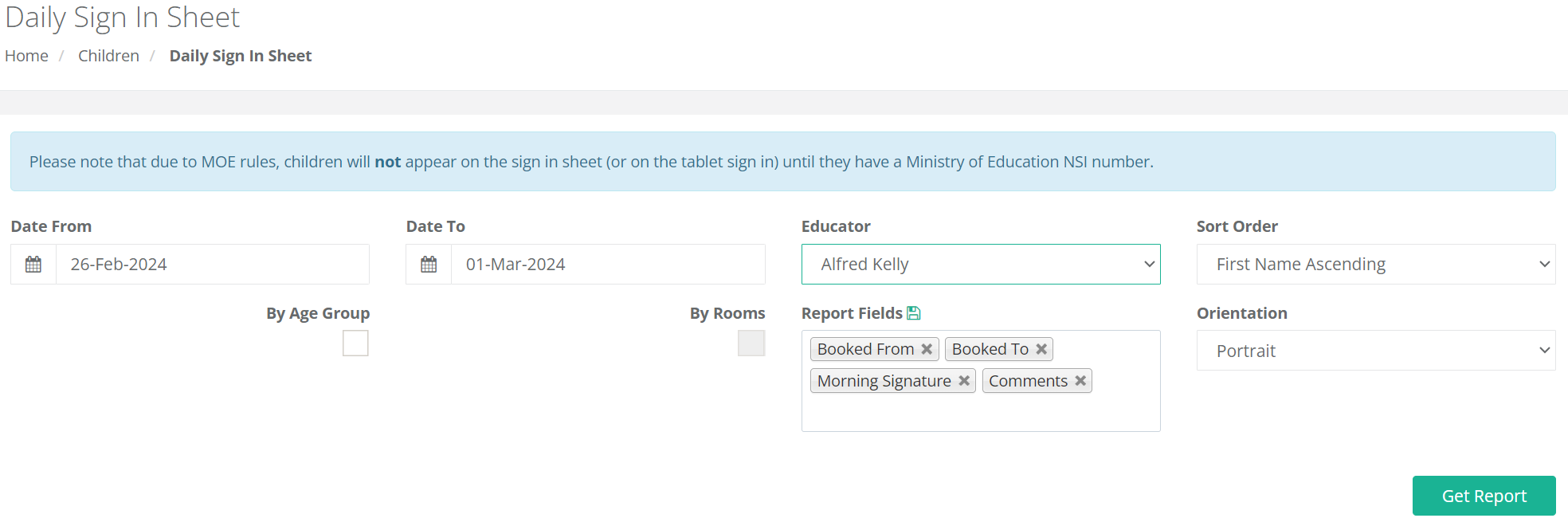 1) To print a roll, navigate to your left-side menu > Reports > Children Reports > Daily Sign In Sheet.