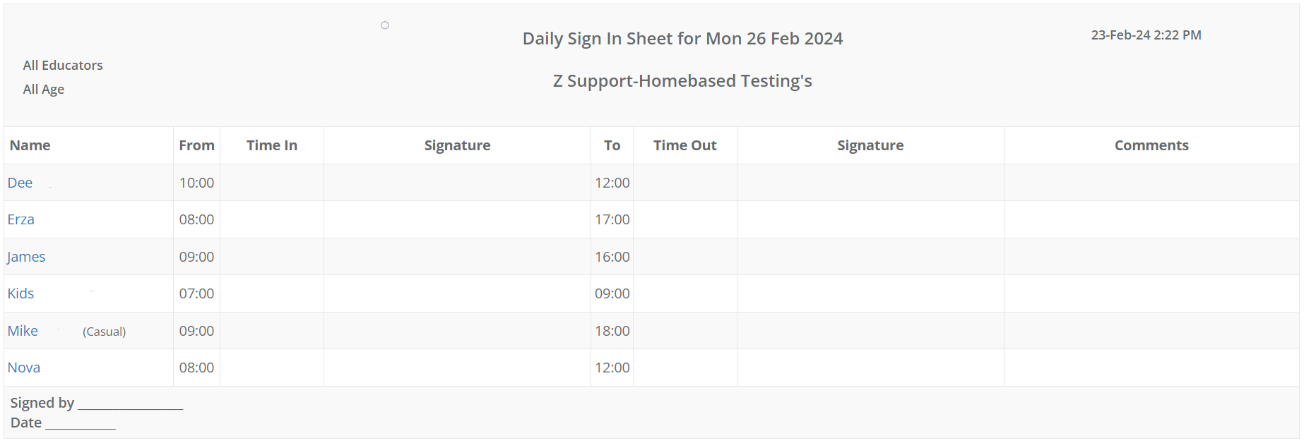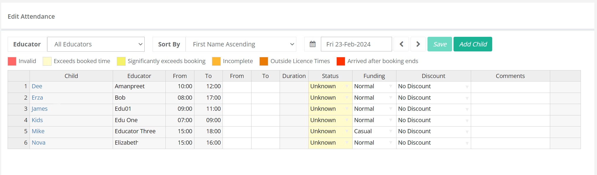 Families can sign their children in and out, but attendances can be recorded by Educators as below: