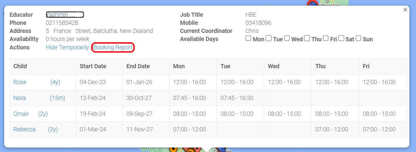 Clicking on an Educator will show their availability and current bookings. Should you need further information, clicking on 'Booking Report' will generate a report for the selected Educator.
